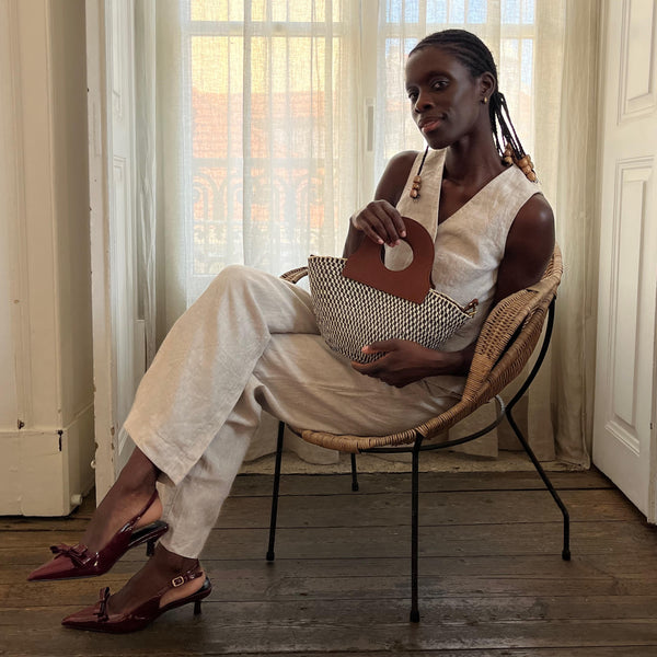 Made in partnership with an all-female cooperative basket weavers group in Kenya, this is our new beautiful handwoven sisal basket finished with our signature chrome-free, naturally dyed Italian leather. Each basket is made by hand in Kenya, then embellished and finished with surplus and deadstock leather by our local makers in the South East of England. Complete with reversible Squiggle Strap to wear over the shoulder or cross-body.